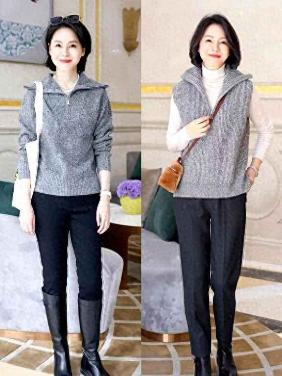 日常休闲穿两件针织套装加乐福鞋,温柔又舒服;商务场合用大衣配高领毛衣,专业又保暖。接送孙辈或家庭聚会,追求舒适自在,穿得有品就行。