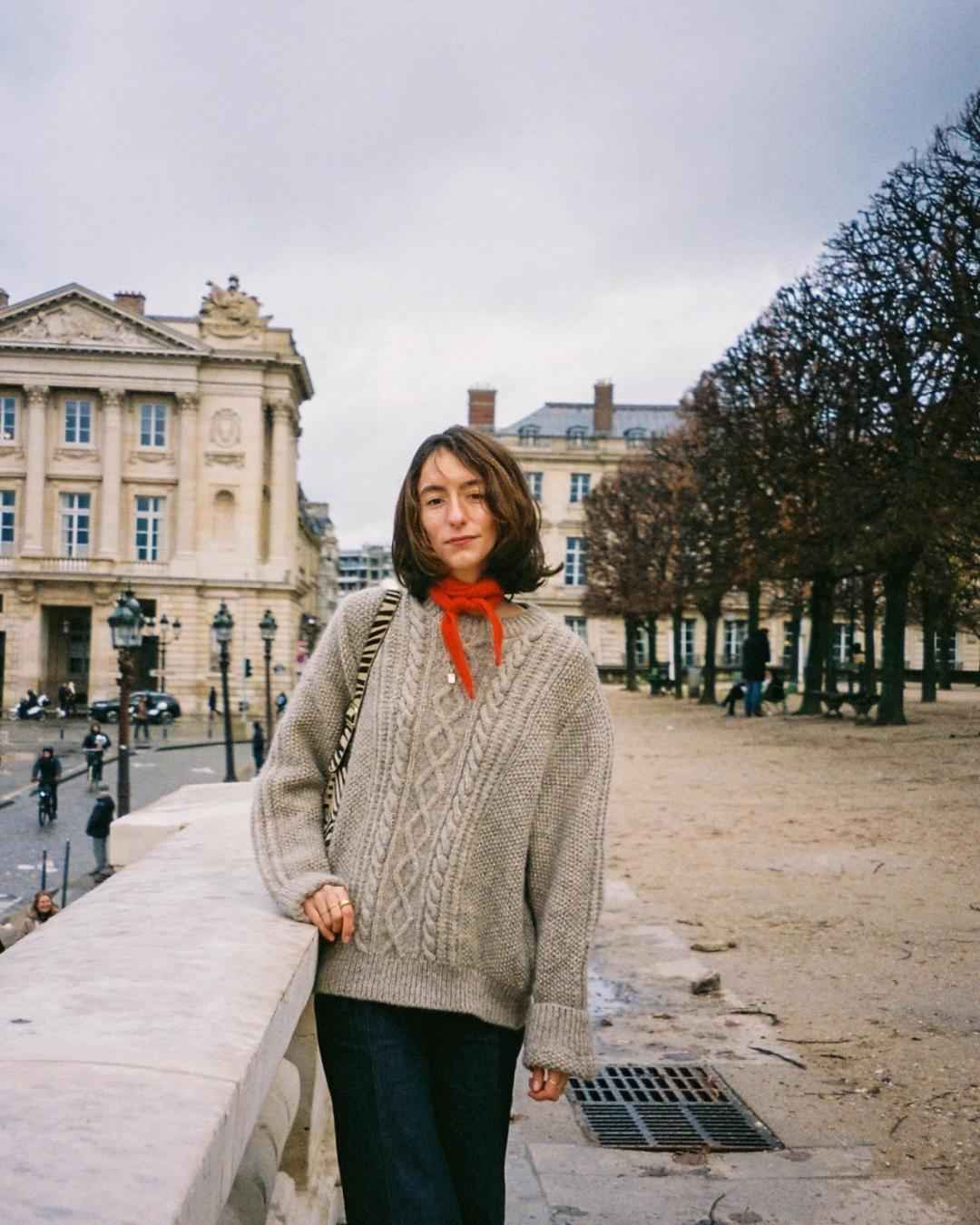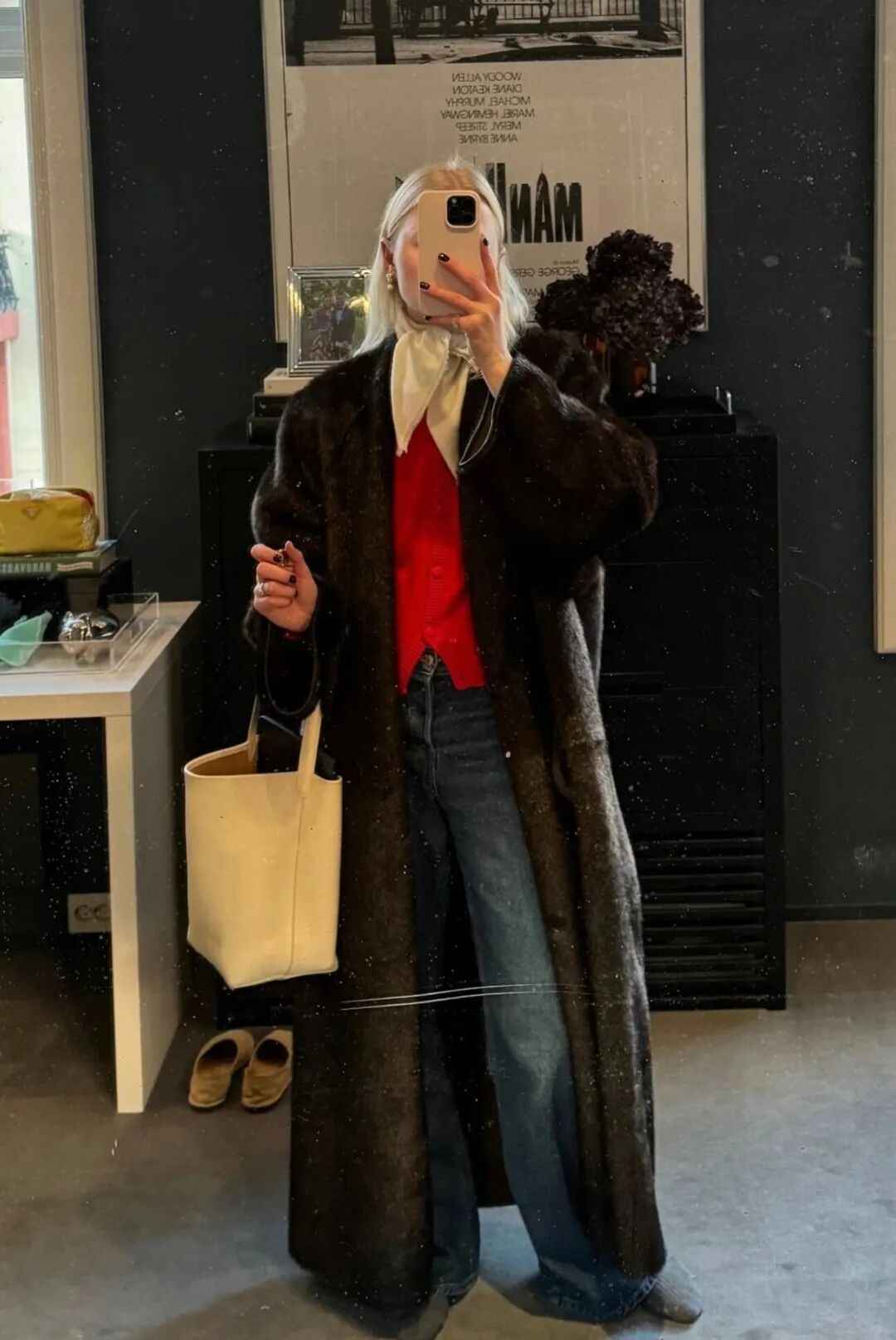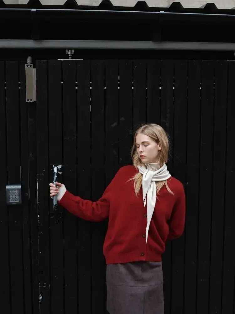 有人担心红色像红领巾,其实毛茸茸的针织质地自带秋冬滤镜,完全不会。棕色毛衣或外套配红色三角巾,是经典不出错的组合。▼