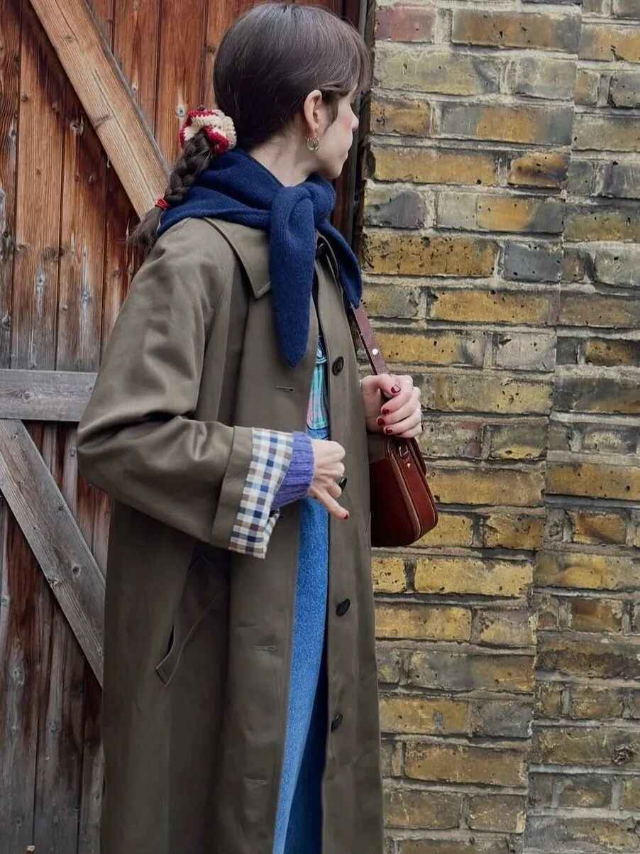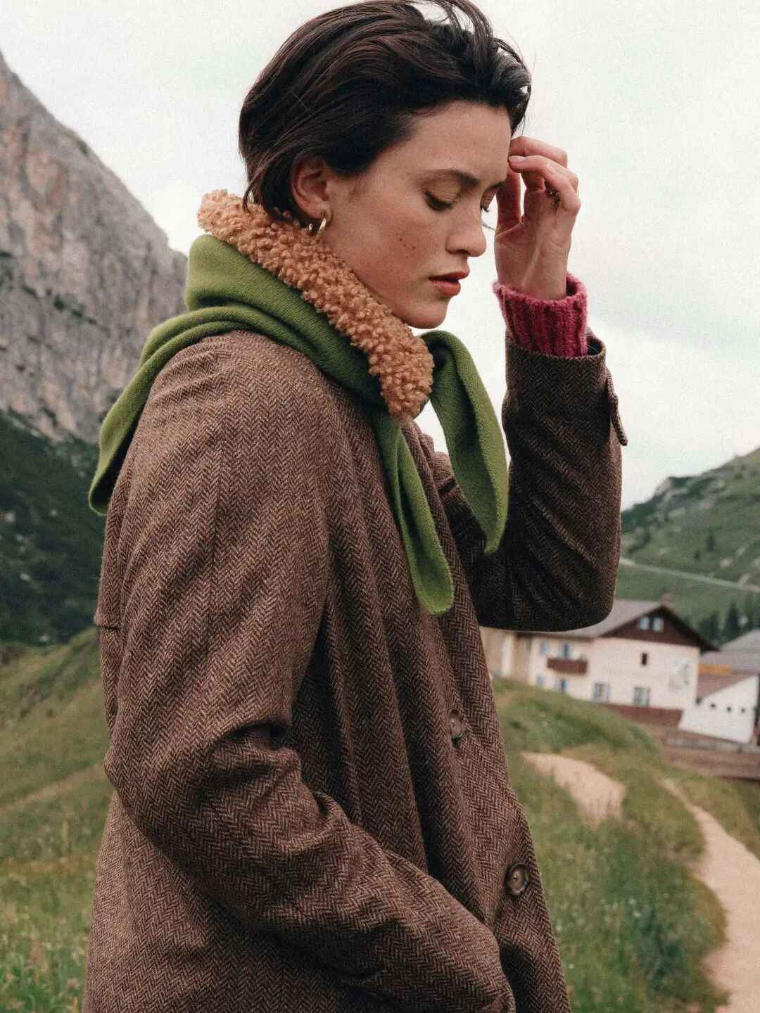 绿色三角巾配棕色外套,就像大地上的新芽,这个组合可以从秋天穿到春天。▼