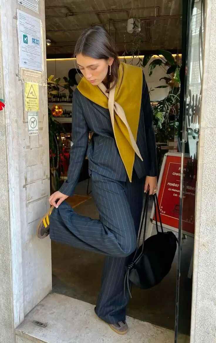想打破西装的正式感,红色三角巾也是利器。德国博主Marie Fim就这么搭。▼