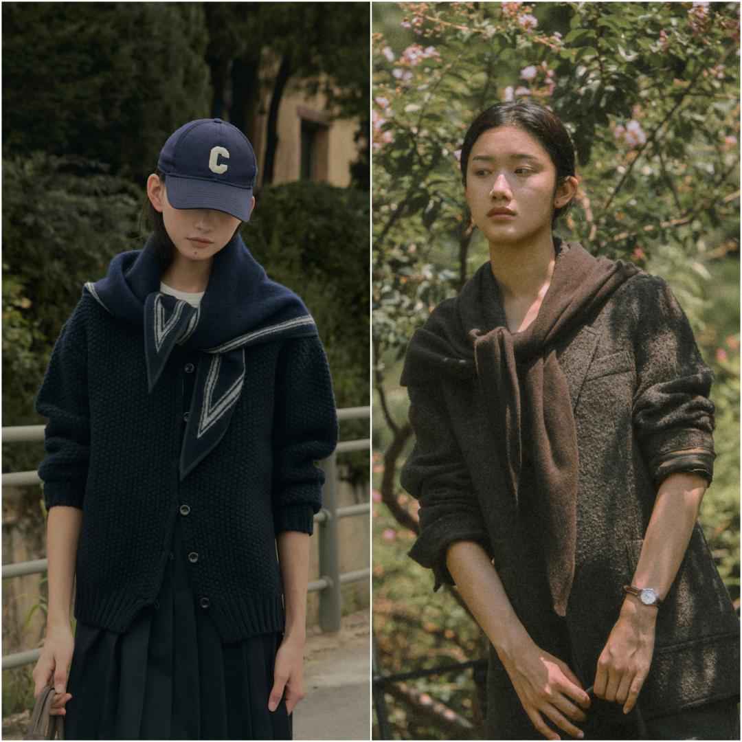 围巾长度影响戴法。一般选140-160cm的,打结后垂在胸前到腰部之间最合适。这两条来自韩国品牌Sagement,官网参考价约412元(左)、365元(右)。▼