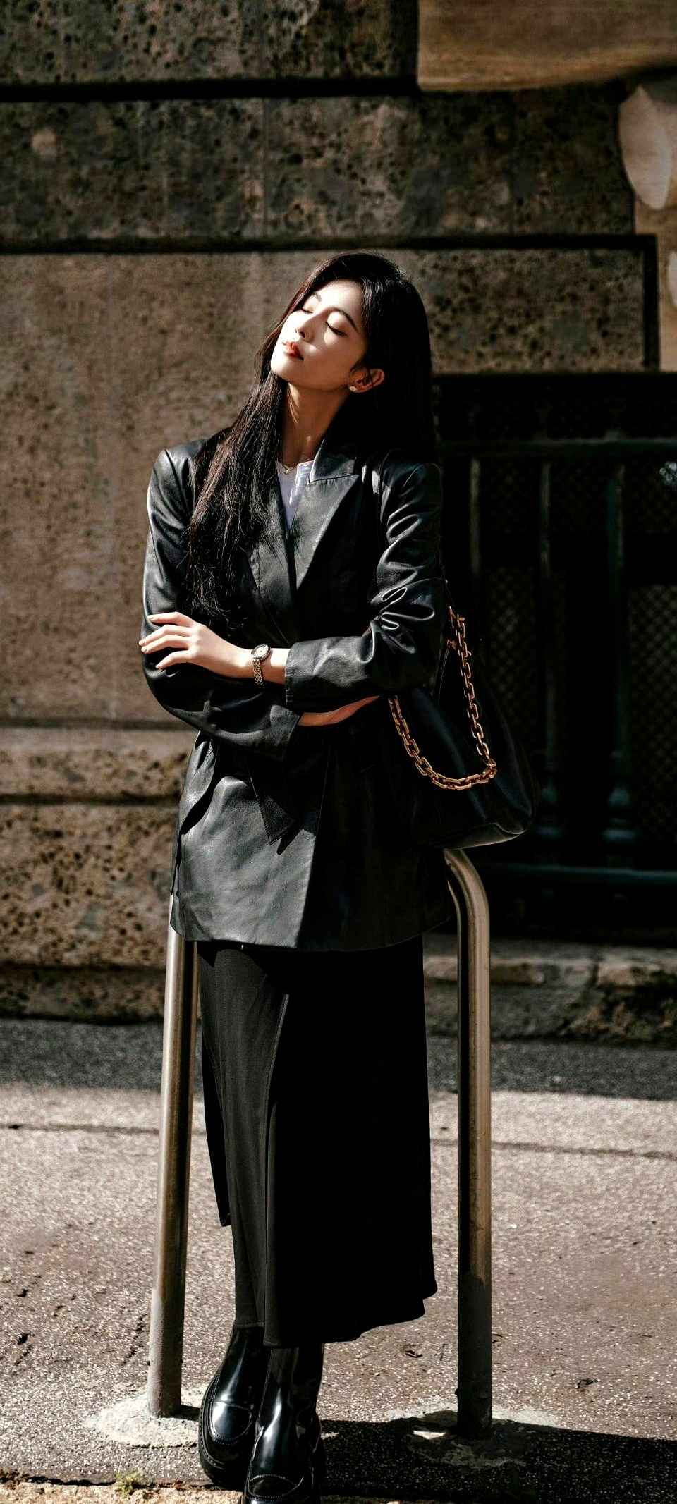 懒人公式:黑皮衣+白T+同色系下装,九成情况下不出错。