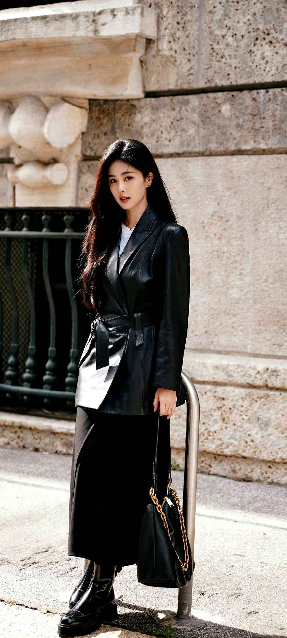 小腿有肉或梨形身材:黑色A字长裙(长度过小腿最粗处3-5cm),带开衩或垂感面料(如缎面、针织),软化皮衣的硬朗。