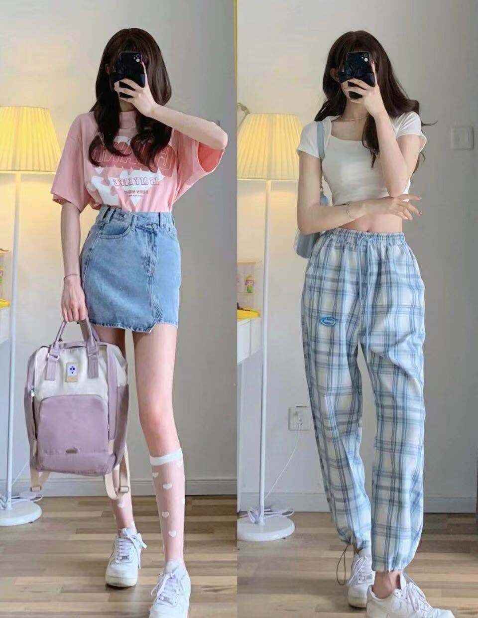 学会短裙穿搭,高个女孩不愁秀身材。牛仔半裙配粉色宽松T恤,显白又活力甜美。