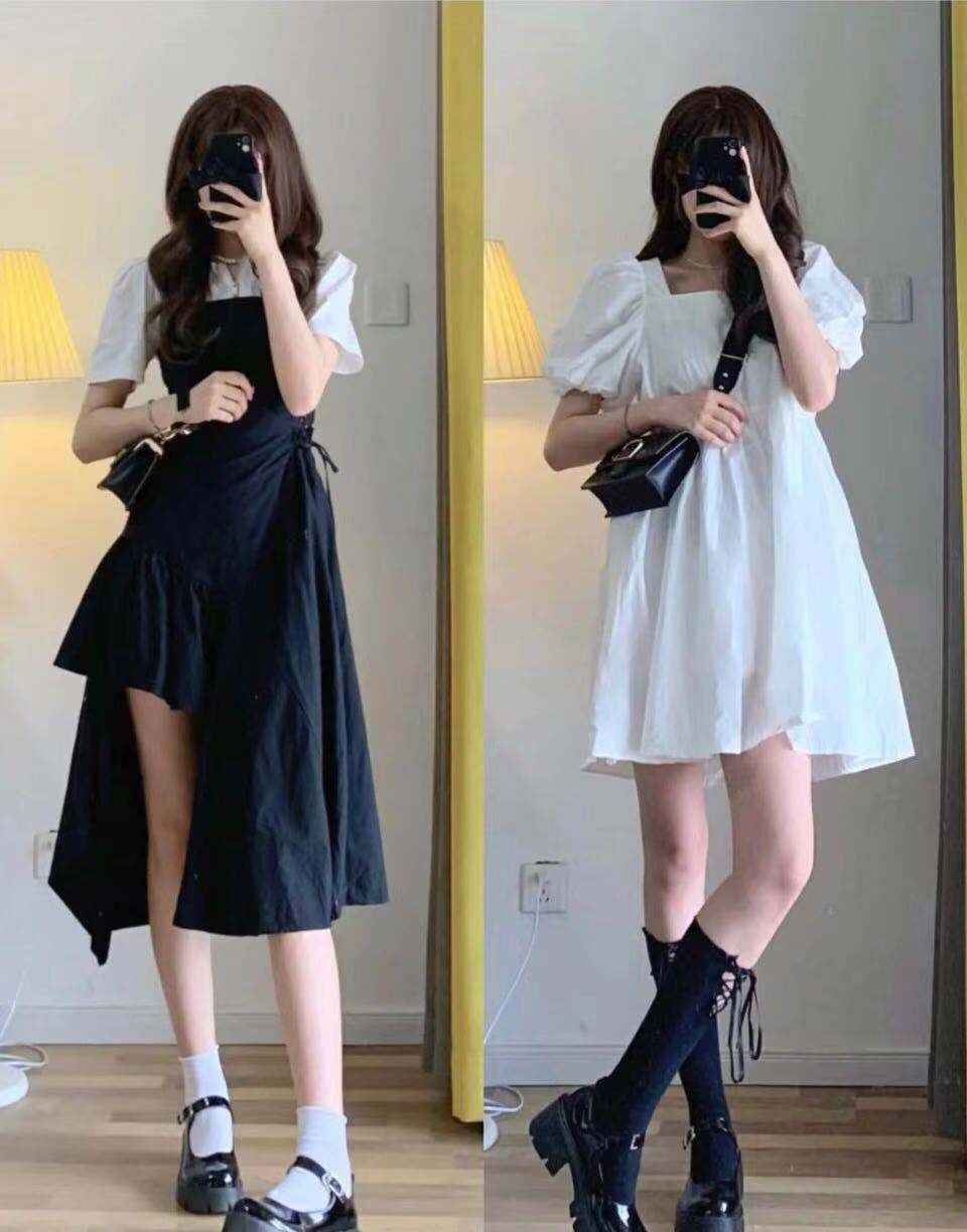 黑白色连衣裙最简约,也最时尚。看起来像假两件设计,上身像T恤,年轻又休闲,但不规则裙摆打破了单调感。