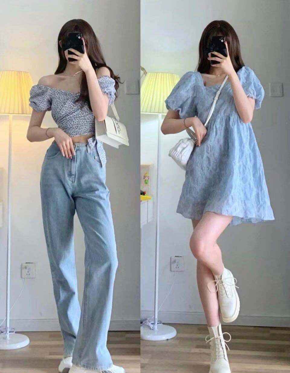 牛仔裤也能搭甜美风,还是高腰款,但上衣换成一字肩碎花衫。清新性感又甜,整体大方招人喜欢!