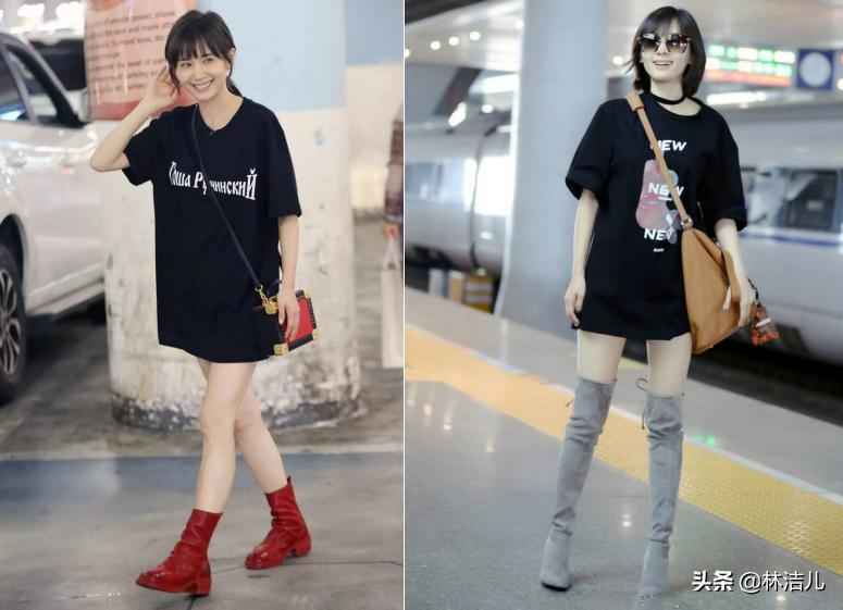 除了帅气外套,试试廓形单品。小个子总穿修身款会腻,oversize服饰能增添酷感。比如王子文的大号T恤,玩下衣失踪秀美腿,洋气十足。