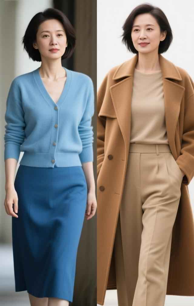 卡其色风衣最忌内搭厚重毛衣,同色系中会显臃肿。建议内搭轻薄同色单品,如米色针织,保持轻盈感。