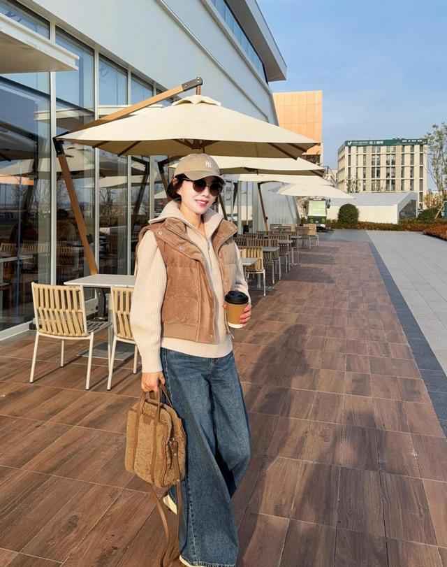 三明治穿法最巧妙:衬衫下摆故意长出两指宽度,针织马甲选腋下收紧的复古款式,外搭西装选大一号的落肩设计。