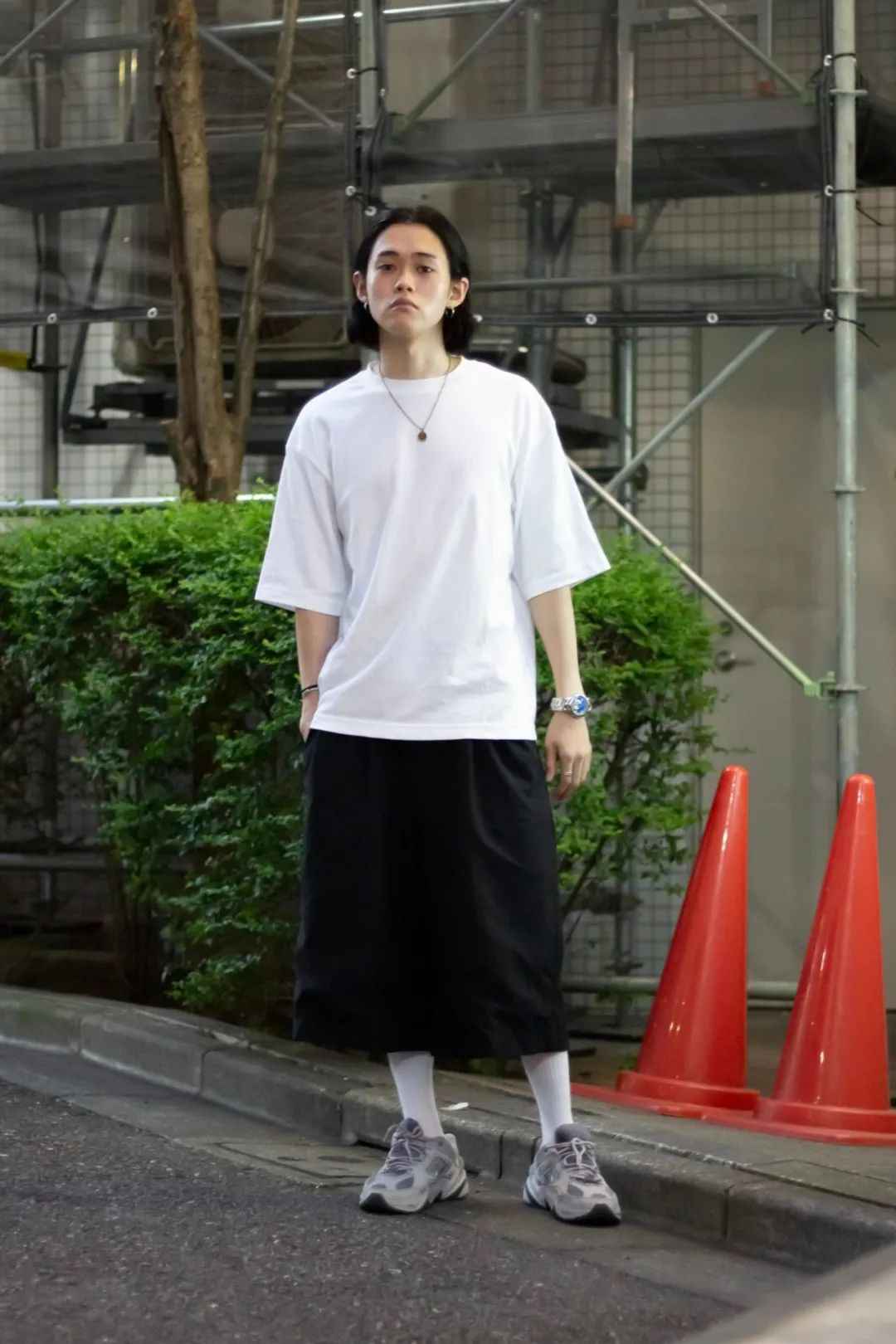 夏天短裤别太短,露出又长又细的腿容易显弱。五分裤最稳妥,过膝也行。