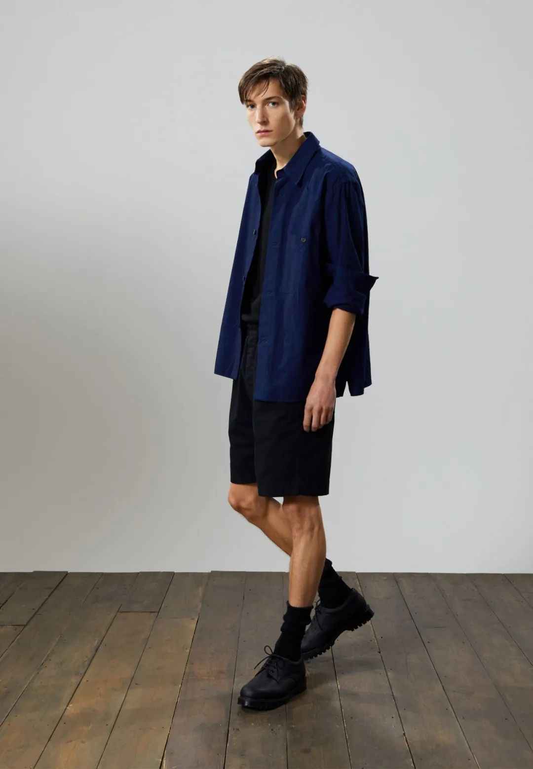 配短裤的上衣优选衬衫,T恤可能太简单,暴露瘦弱感。