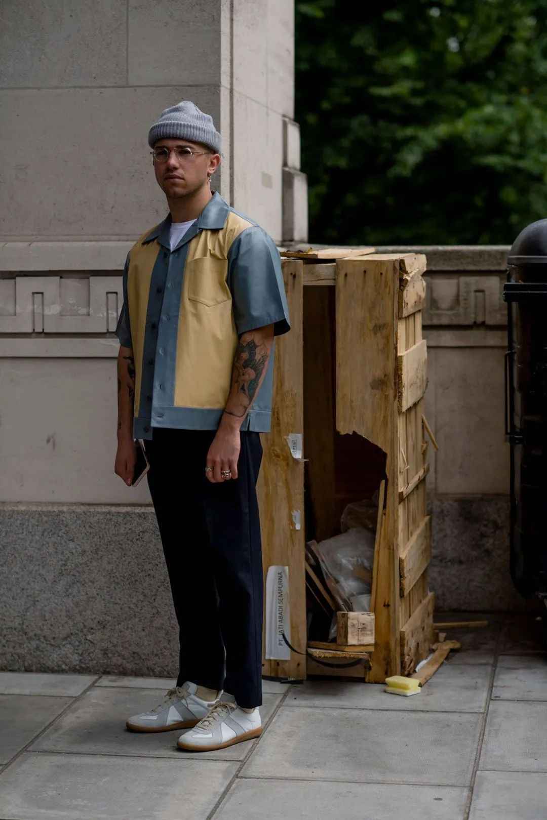 军工装裤也不错。口袋结构能增加身形份量,增添复古硬朗感,配皮鞋更显精致粗犷。