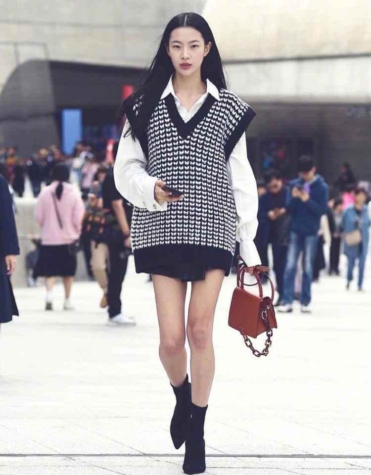 小个子可以试针织马甲玩“下衣失踪”。黑白马甲内搭白衬衫,“内长外短”增加层次,配短裙和高跟鞋,露腿面积大更显高。