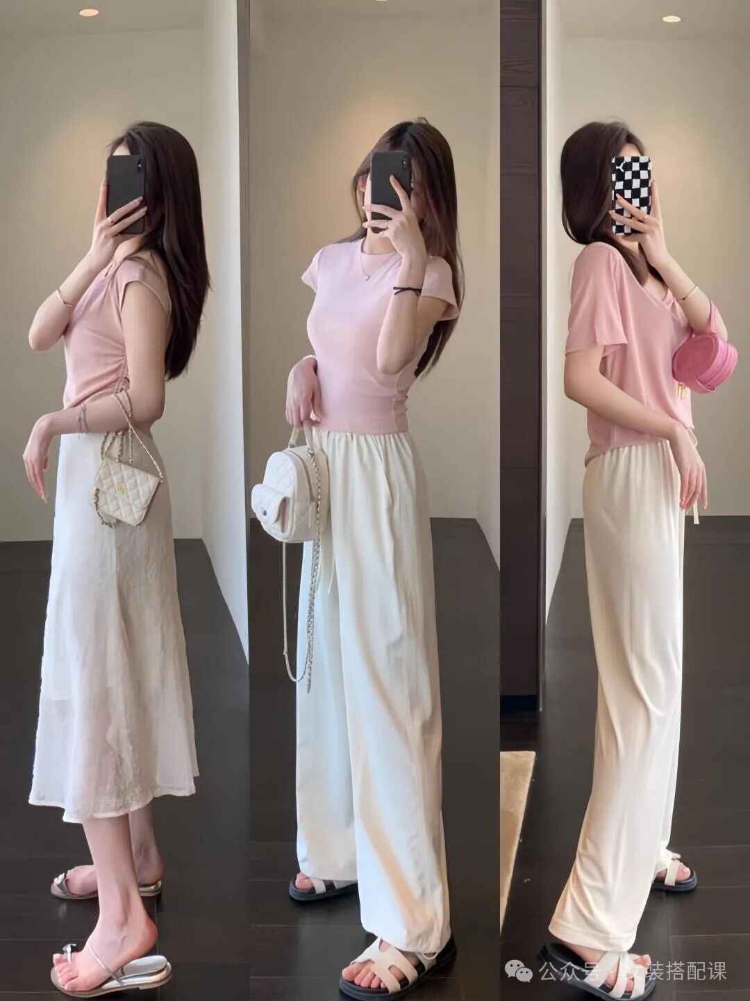 粉色配白色总是安全又清新,但要避免配黑色,因为容易显得沉闷。灰色系和粉色搭起来也很柔和,适合日常。