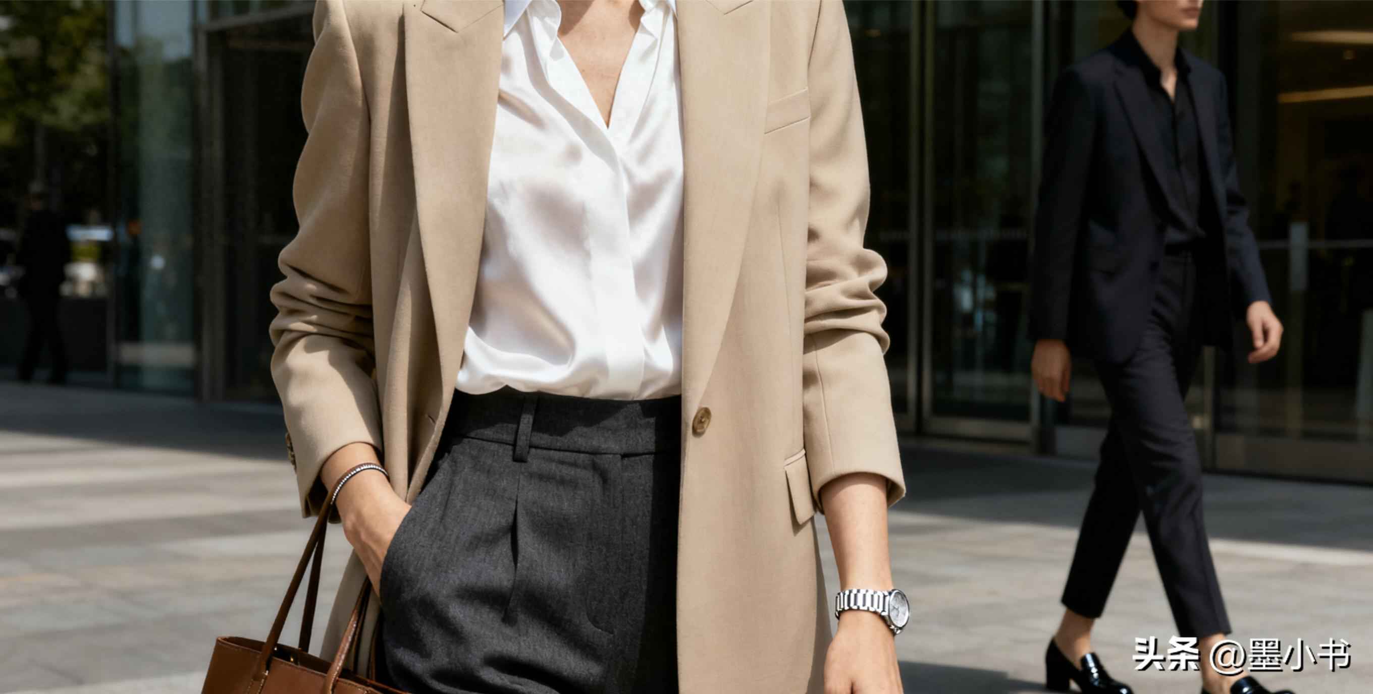 - 核心搭配:燕麦色垂感西装 + 白色真丝衬衫 + 高腰直筒烟管裤(深灰色) + 低跟乐福鞋(黑色)