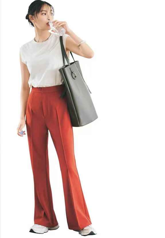 这条红裤子的色调不是纯红,而是加入了橙色和黑色,降低了浮夸感,更显质感和讲究。