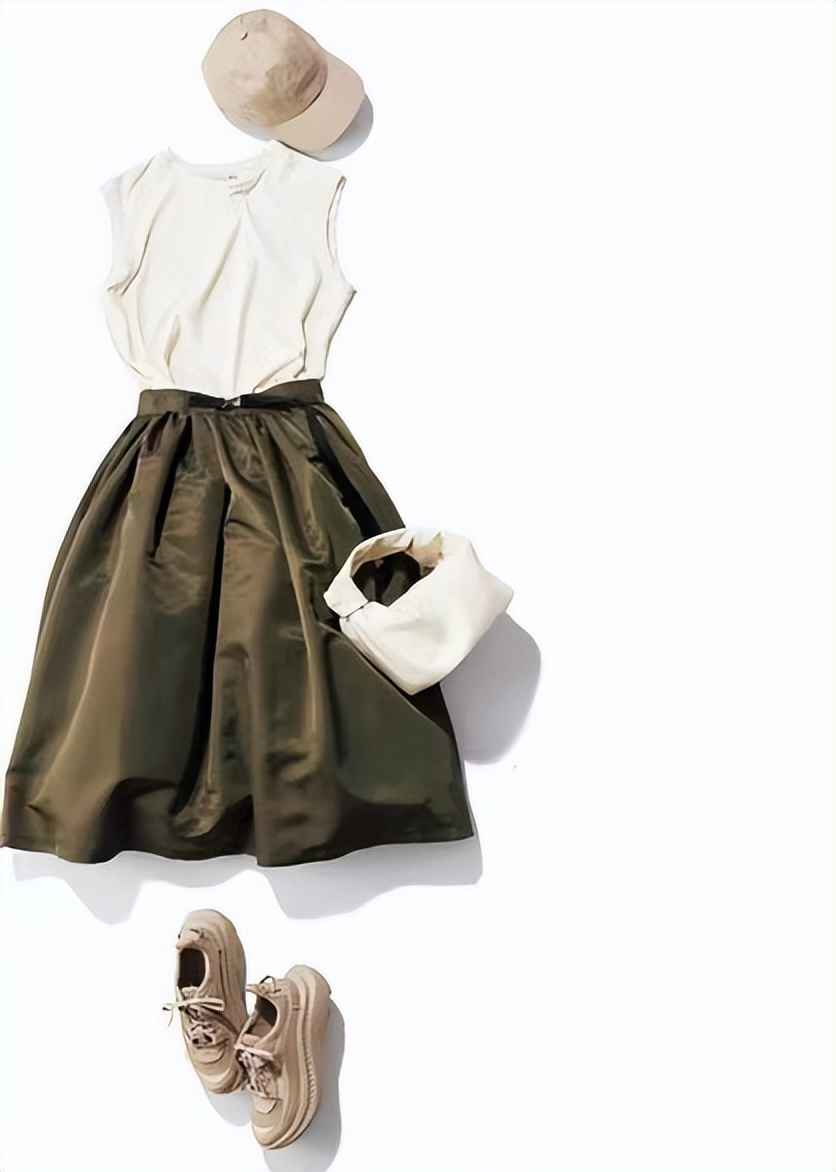 这条蓬蓬裙,女人味十足,但用中性颜色和光泽面料突出了休闲不羁感。搭配无袖背心和可爱包包,休闲鞋和棒球帽点缀,完美演绎休闲与优雅的混搭。