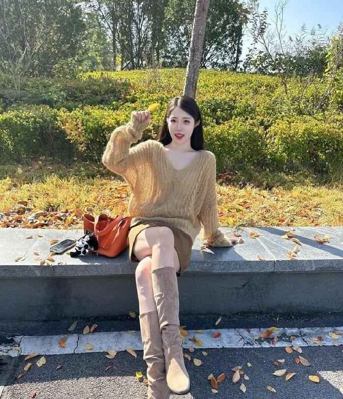 记得前阵子,我被一张朋友圈照片深深吸引。照片里,一位小姐姐穿着大地色系的搭配,低调中透出温柔,美得让人移不开眼。她上身是一件燕麦色V领针织衫,袖子是宽松的蝙蝠袖设计,慵懒又精致,那种米黄带点奶茶的色调,柔和得恰到好处。下身配了一条咖啡色短裙,裙子的深色与上衣的浅色形成鲜明层次,整体看起来温暖又高级。脚上那双浅咖色麂皮绒长靴,完美呼应了“上浅中深下浅”的搭配法则,整个人就像一幅秋日油画,柔和却不单调。