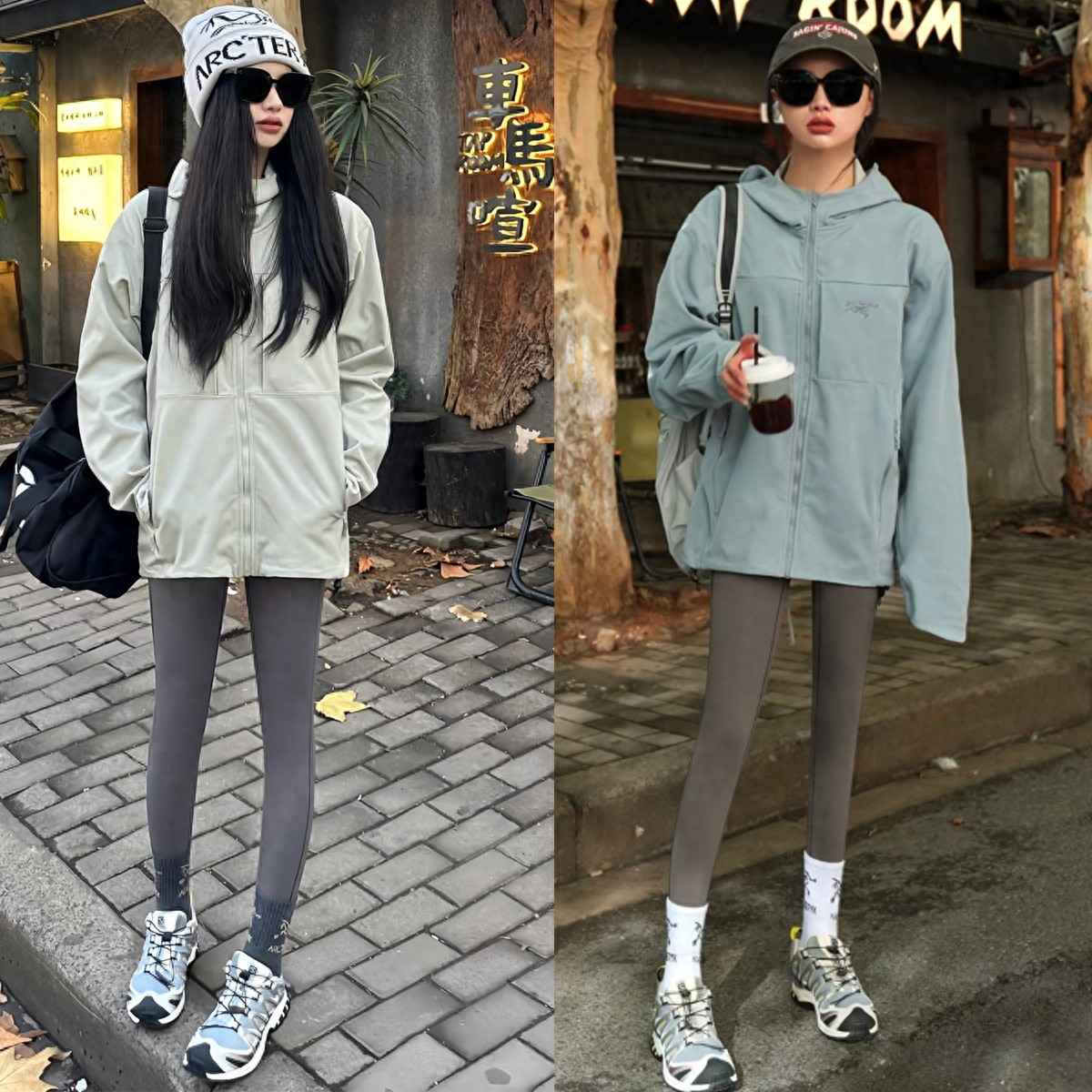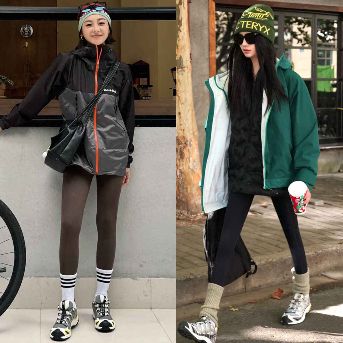 “冲锋衣+瑜伽裤+萨洛蒙”偏户外风,直接穿去上班可能有点违和。简单一招:在瑜伽裤外叠加袜套,这个小细节能中和风格,让穿搭更日常、更显瘦,瞬间提升潮流感。