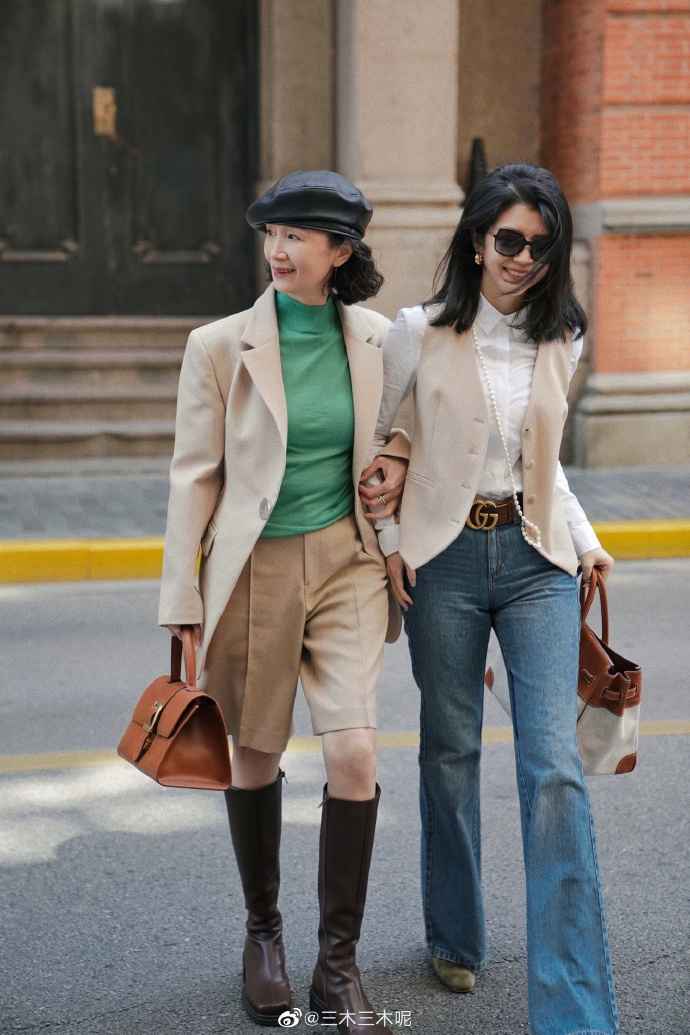 时尚博主三木母女的穿搭中,米棕色系的大地色绝对占了一大半!