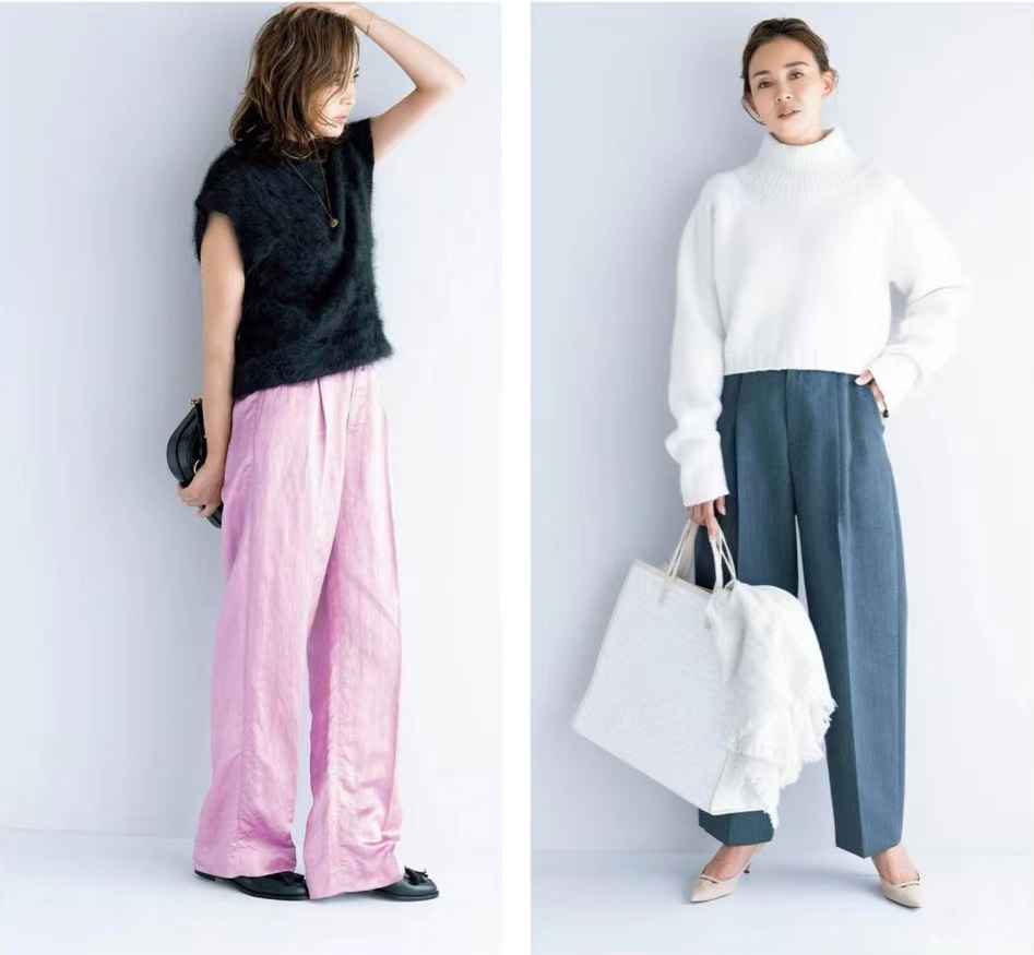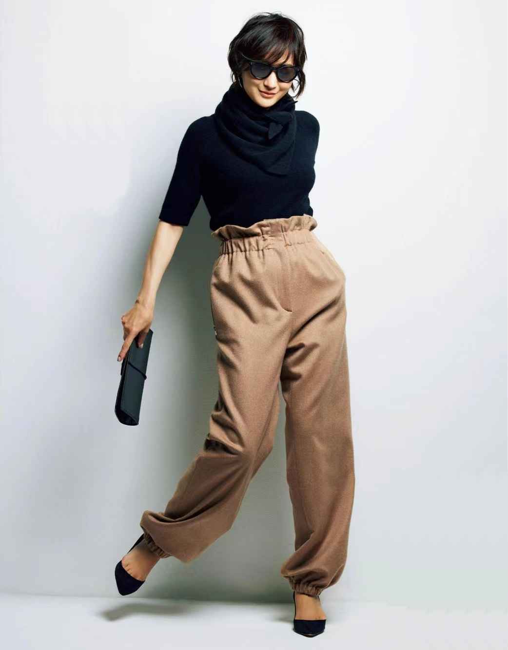 黑色针织衫配米色裤子,相信你也试过。但为什么总显得普通?问题在裤子是否有个性。高腰花苞款,束口阔腿设计,时髦感立马提升。