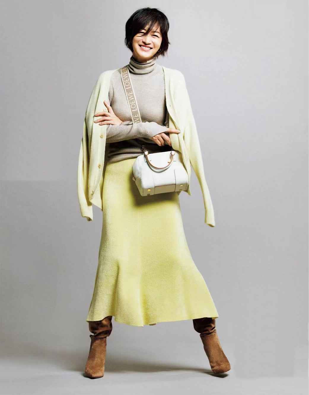 浅柠檬黄针织外套和半裙,内搭米灰色高领衫,雅致又讲究。用棕色靴子平衡整体,深浅得当。既呼应又点睛,一举多得。