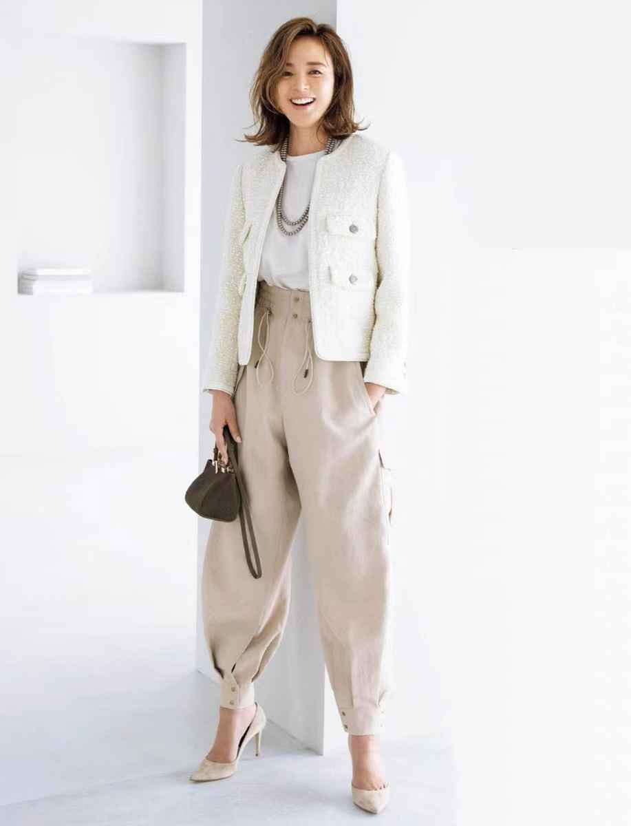 一套成熟女性的优雅穿搭,米色工装裤的酷感瞬间成为亮点。拒绝老气,不要普通,释放时髦态度。