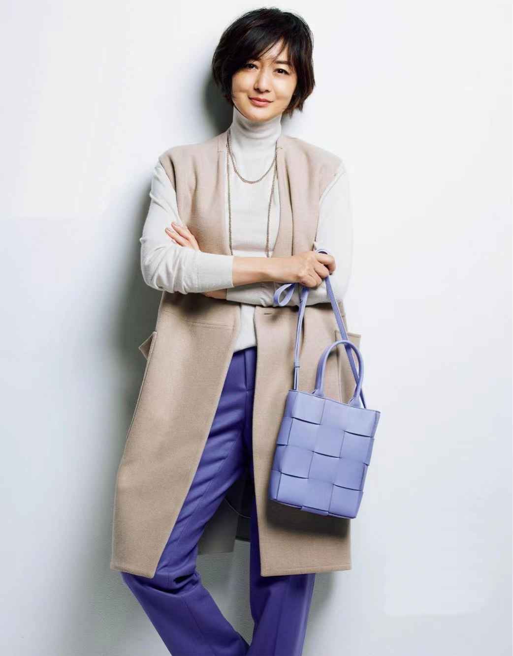 米色与紫色,看似不搭,却能在强对比中融合华丽与优雅。米白轻薄针织衫,配米色长马甲,层次感十足。