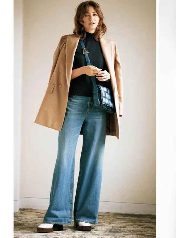 穿驼色西装不会搭?来一条牛仔裤吧。黑色毛衣过渡,白色鞋子提亮,全是经典基础款搭配,一点不逊色。