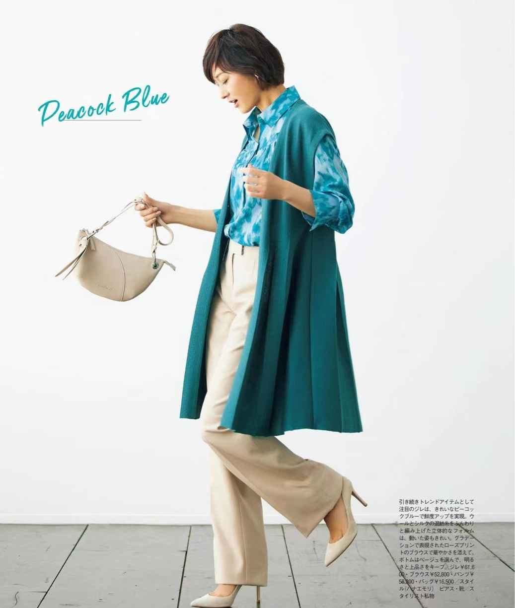 鲜艳色搭配是否夸张,与上下装有关。换一下顺序,将孔雀蓝用在花衬衫、长马甲上,奢华感扑面而来。