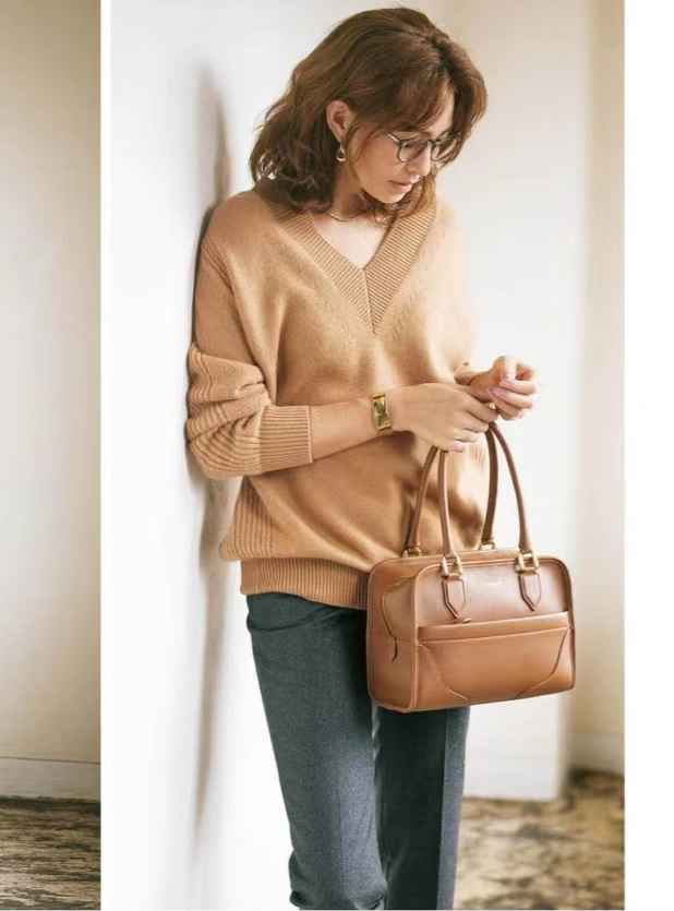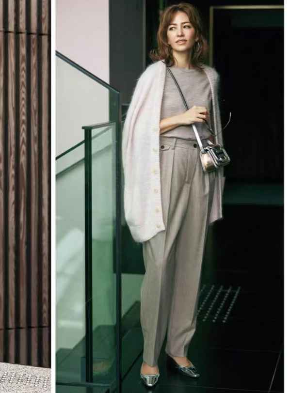 驼色毛衣配灰色西裤,略显正式的穿法。它们搭配好看的秘诀在于:松弛感。比如,毛衣宽松,大V领,随意卷袖子...营造法式慵懒风。