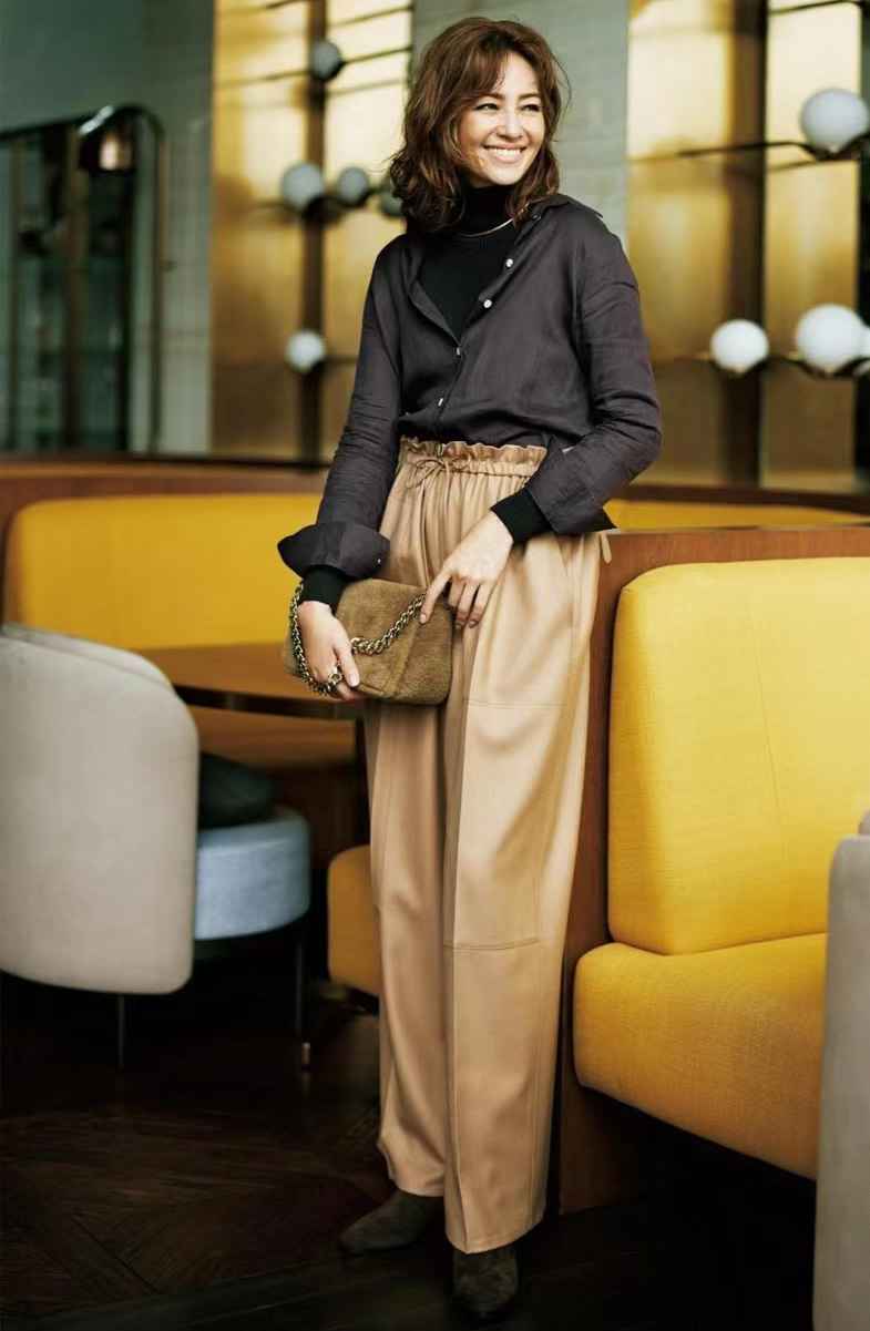深棕色和驼色,共同演绎同色系的优雅。深浅对比明显,容易打造层次。图中驼色长裤有个性亮点,看起来更时髦。