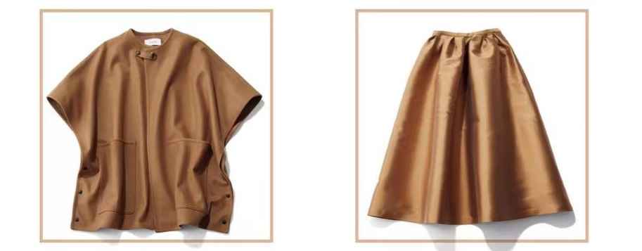 驼色半袖外套,设计感强,层次叠穿很棒;而光泽面料,让驼色半裙更显高级,来自版型和质地的混搭,永远是米色的重点。