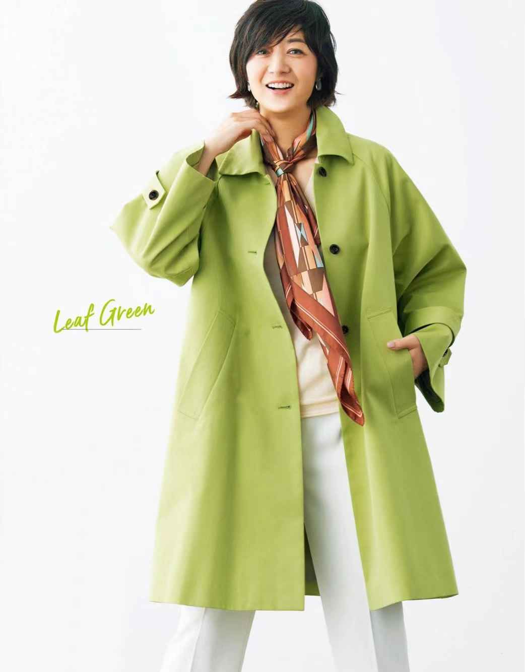 翠绿的叶绿大衣,绝对是吸睛单品。很难驾驭的颜色,可以加一条棕色丝巾点缀。小面积使用,降低整体压迫感。