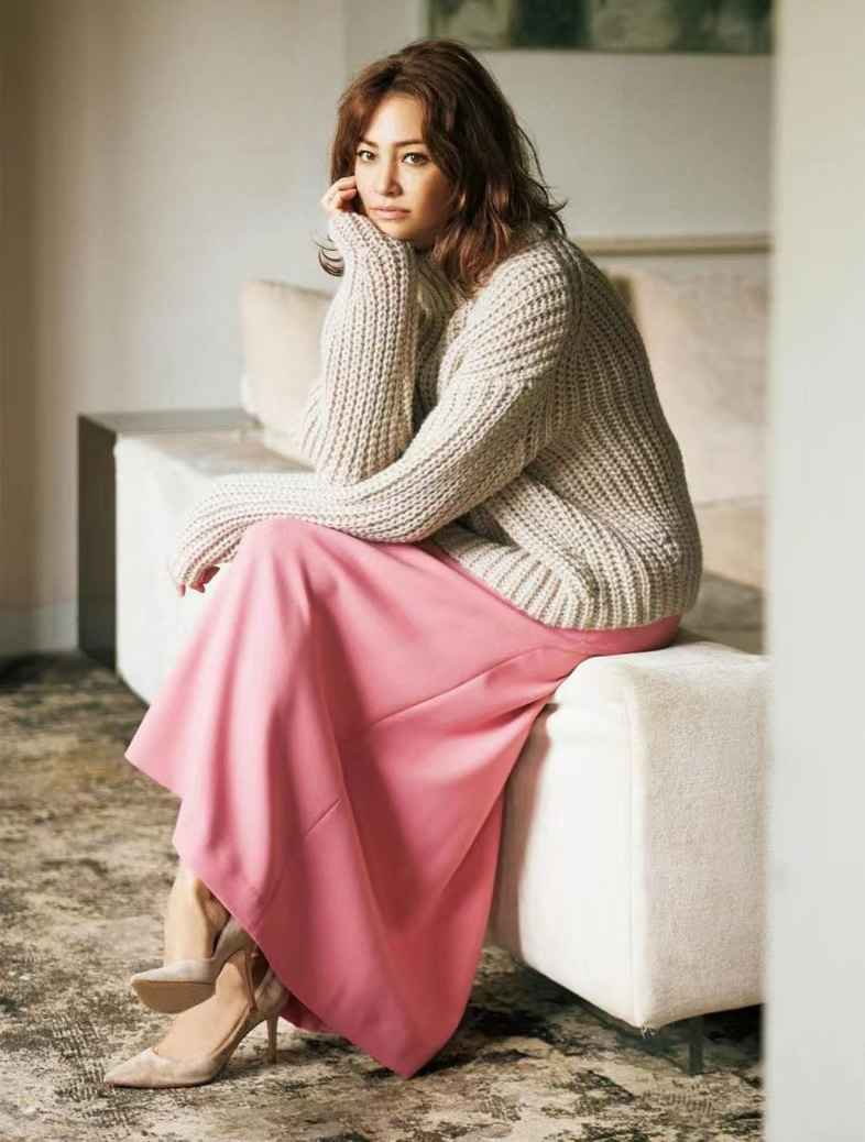 比淡粉更热烈的玫粉色,带点冷调酷感,为甜美加分,更有性格,适合成熟女性。这样一条半裙,配沙米色毛衣绝佳。
