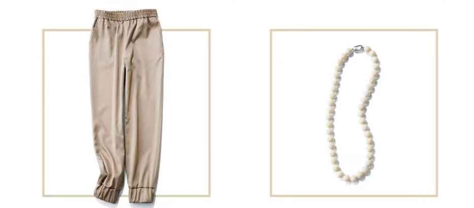 色调淡雅柔和,黄色感减弱,带点沙石的清冷古朴,为米色增添大气空间。光泽工装裤、珍珠项链,脱俗有品位。