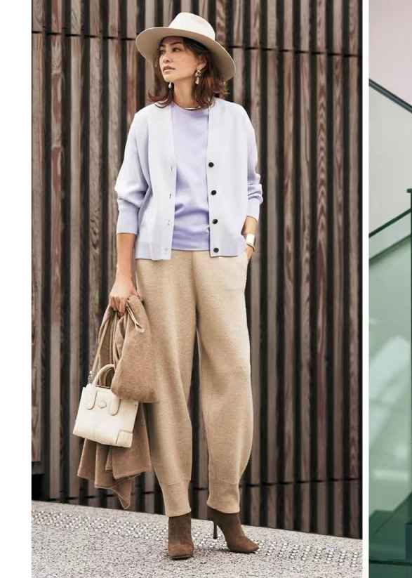 柔和的丁香紫上衣,淡雅婉约,浪漫感十足。外搭米灰色开衫,下配沙米色休闲裤,看似不搭的组合,也有时髦生机。
