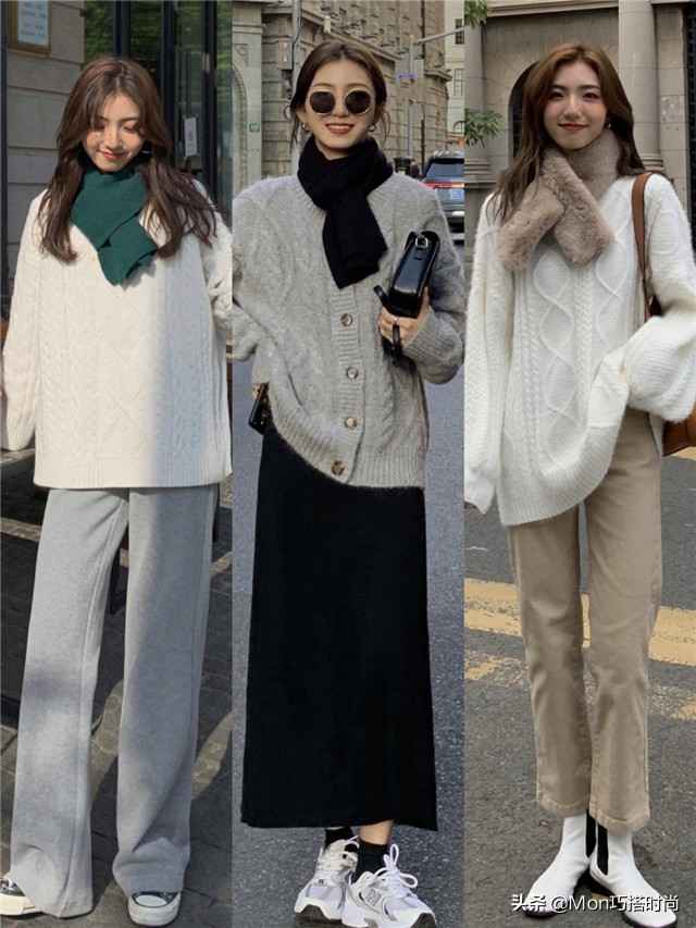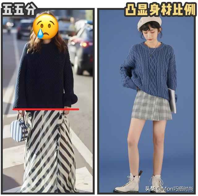 长度和版型都得合适,比如毛衣长度最好在腰部最细的地方,版型要贴合腰围,这样搭配基本不会出错。下面这种修身的毛衣就能修饰腰线,下半身配宽松的裤子或裙子也没问题,还能优化腰臀比例。