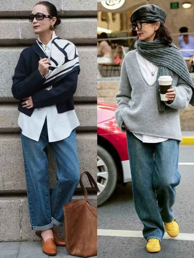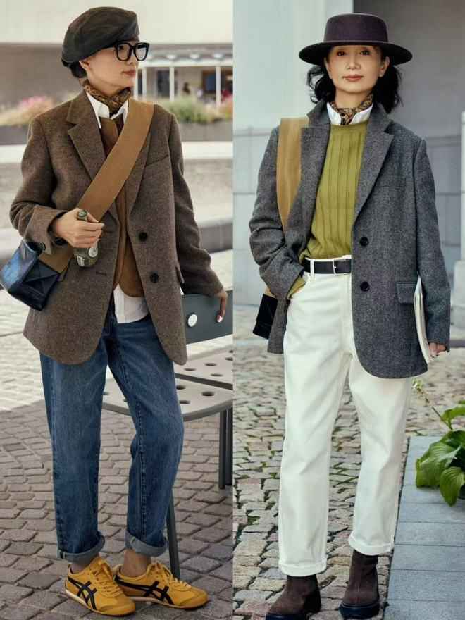 五六十岁的女性想穿得简约洋气,可以选低饱和度西装外套,内搭针织衫,配上蓝色或白色牛仔裤,脚穿黄色德训鞋或咖色短靴,休闲又干练。