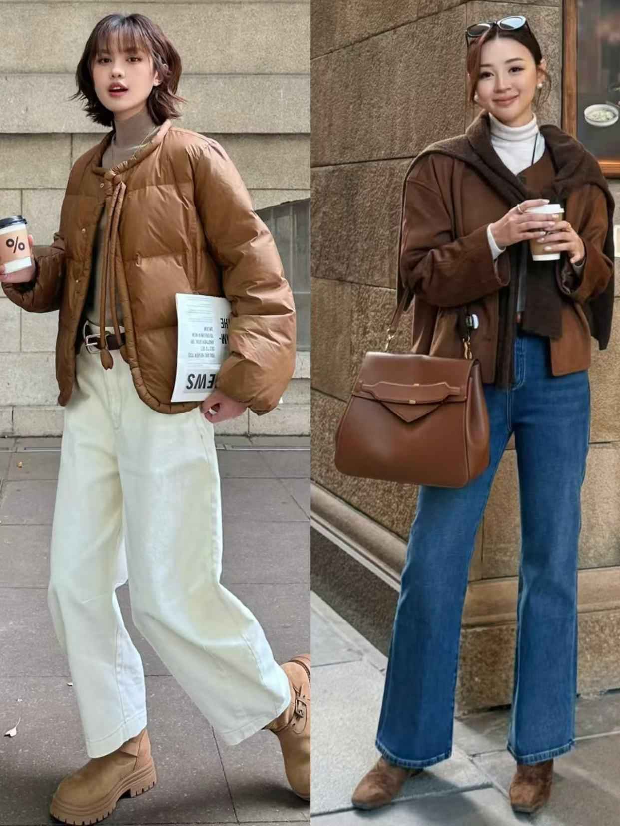 选经典的驼色短靴皮鞋,搭配牛仔裤和咖色针织衫,加上无袖小外套或马甲,适合南方女性借鉴。