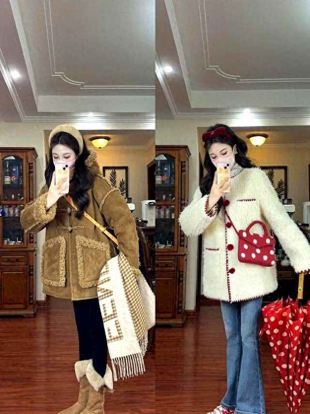 焦糖棕麂皮绒套装搭配奶白波点毛绒外套,简直是冬日绝配!焦糖棕外套自带复古感,毛绒边设计软糯又保暖,配上同色雪地靴和格纹围巾,瞬间变身街头复古甜心。奶白色毛绒外套用红色镶边点缀,吸睛度满分,波点包包和雨伞巧妙呼应,再穿条喇叭裤和红色纹路鞋,甜美感直接拉满!