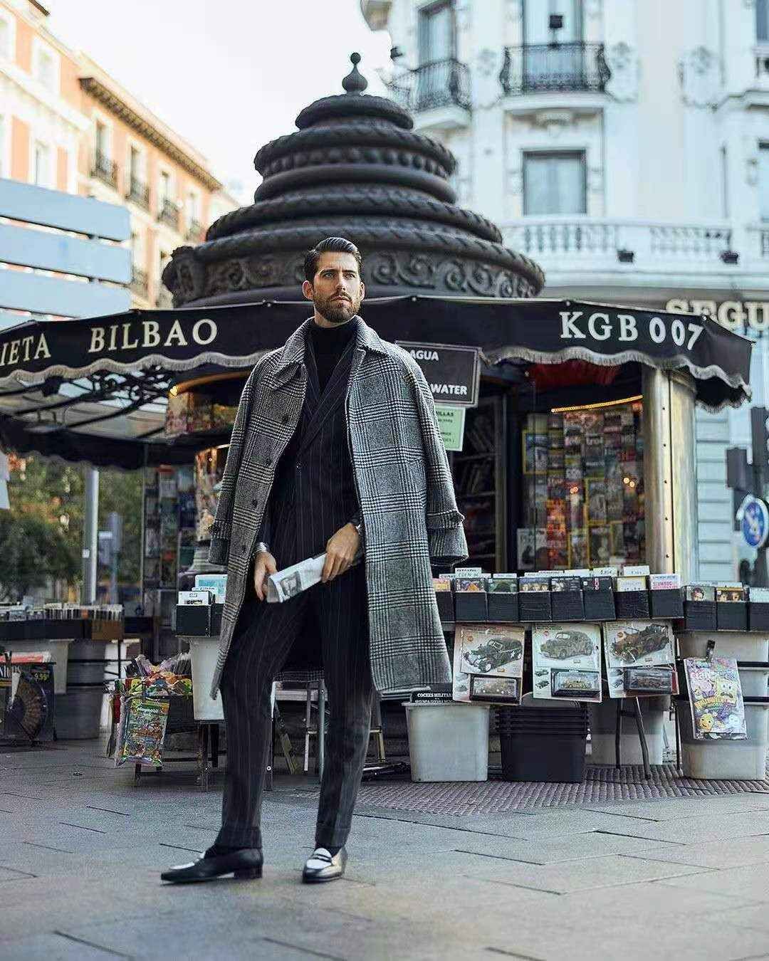格纹大衣+西服套装:经典传统组合,秋冬常见穿搭。厚重复古的灰色格纹大衣,充满英伦风,彰显绅士优雅。