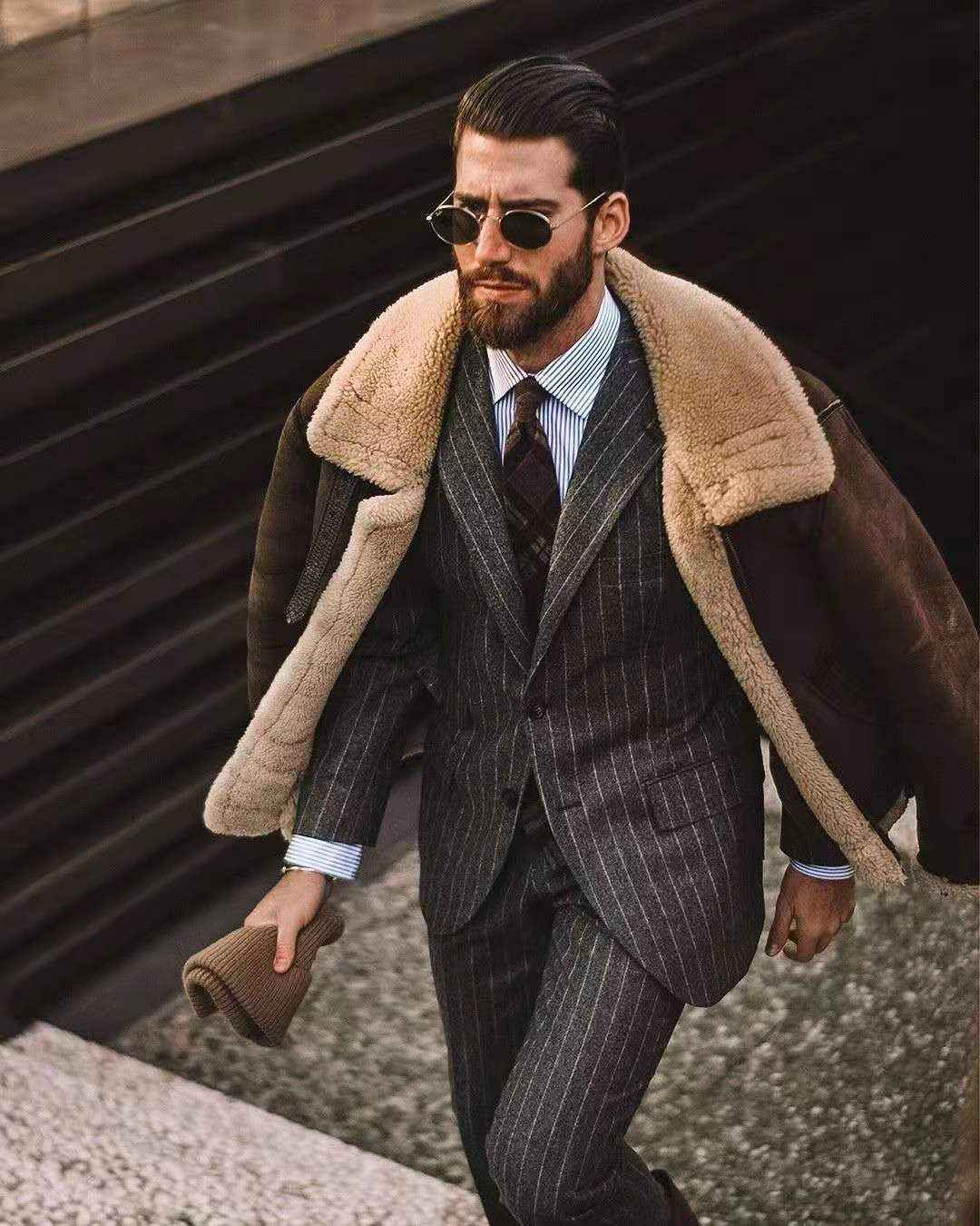皮毛外套+西服套装:冬季男性穿搭要避免臃肿,尤其搭配正式西装和领带时。叠穿一件皮草短外套,或披或穿,皮毛元素大气沉稳,与西装完美融合。细节如衬衫袖口和领口,更显时尚。↓