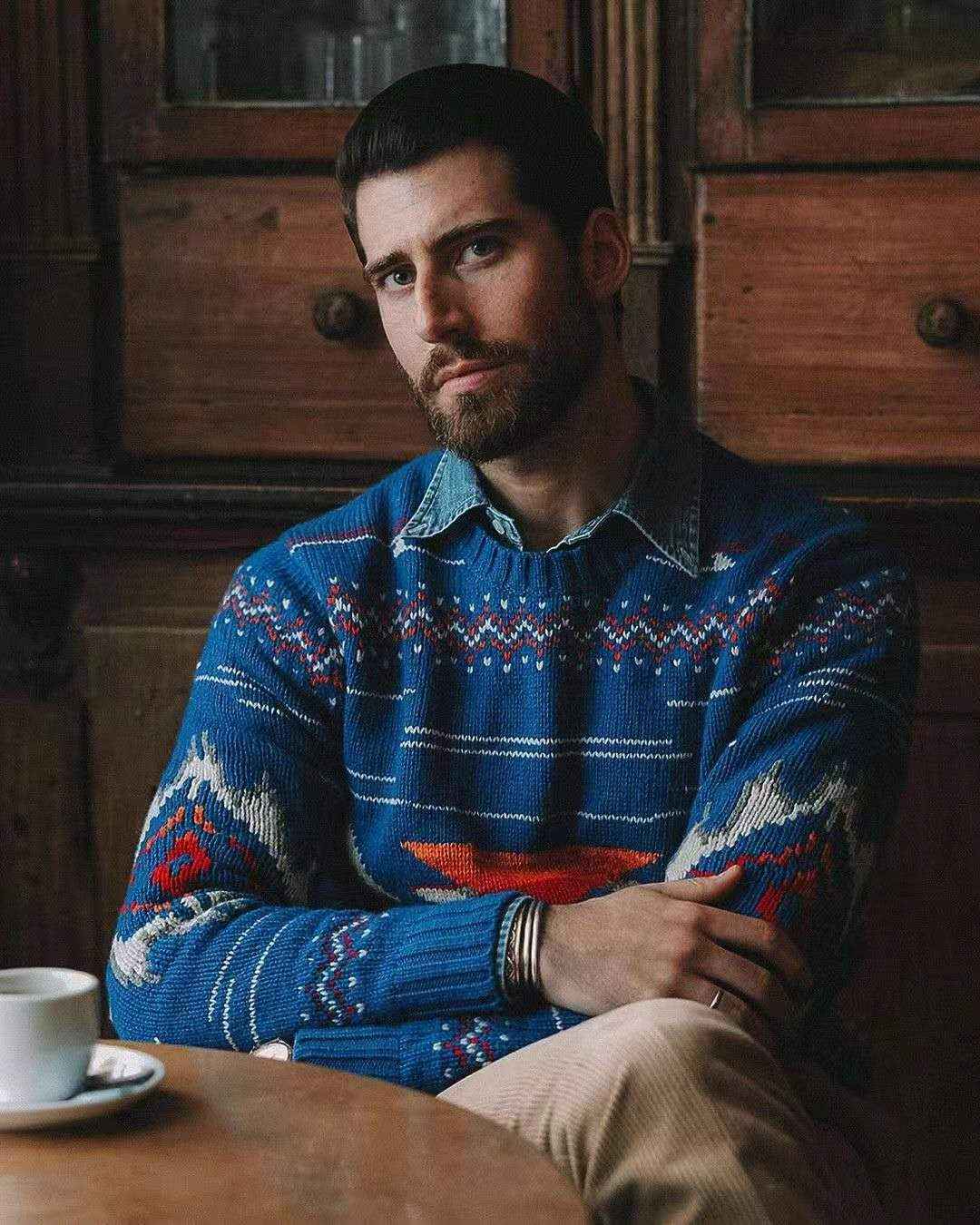 牛仔衬衫+蓝色毛衣:红蓝配毛衣复古有型,男人穿花色只要搭配得当,一样吸睛。