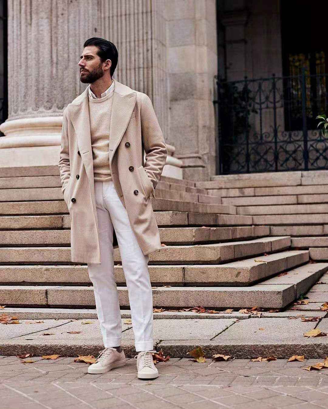 大衣+小白裤:白色裤子体现男人的干净品位,是时尚的小细节。