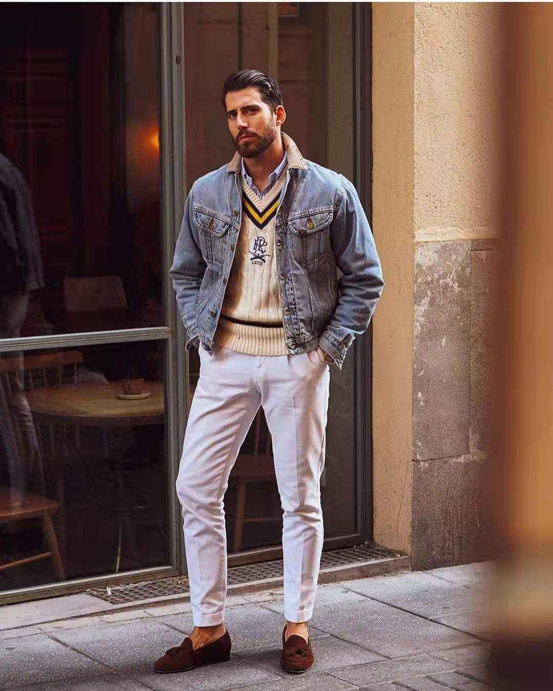 这种搭配是不是很眼熟?V领针织衫本就源自男装。内搭蓝色衬衫,呼应牛仔外套。