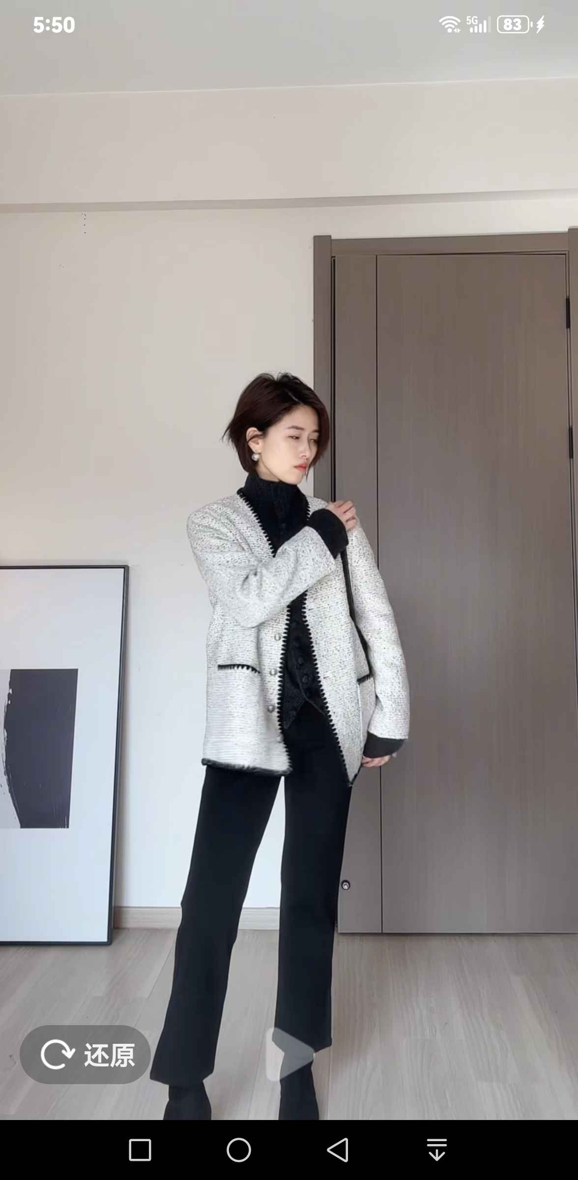 周三出外景做户外直播,裤子必须安排!菱形格纹毛衣搭可拆围巾的黑色短大衣,围巾和扣子有真皮点缀,低调又高级。裤子是加内衬的加厚羊毛款,再也不担心腿冷。