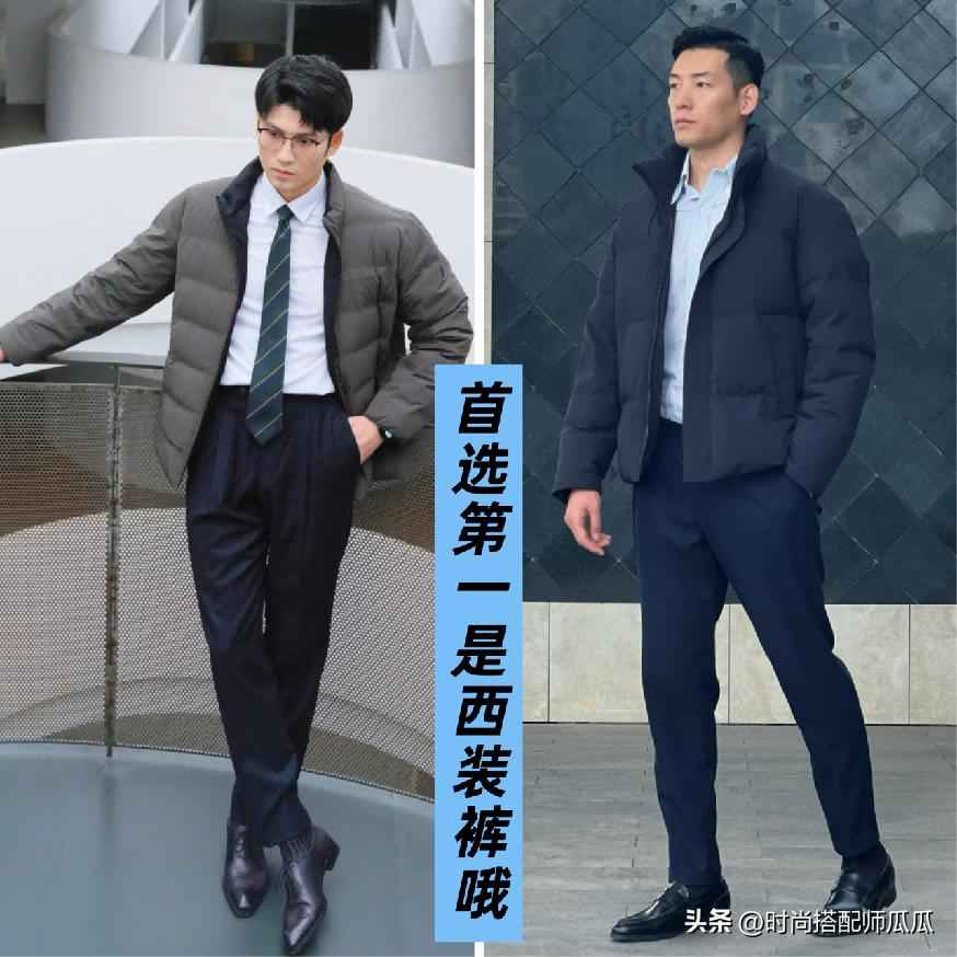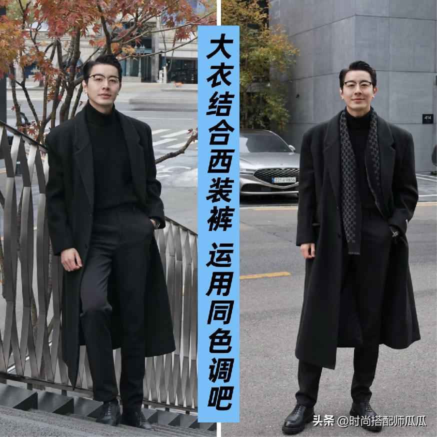 ⑴ 大衣or羽绒服,搭配同色调的西装裤