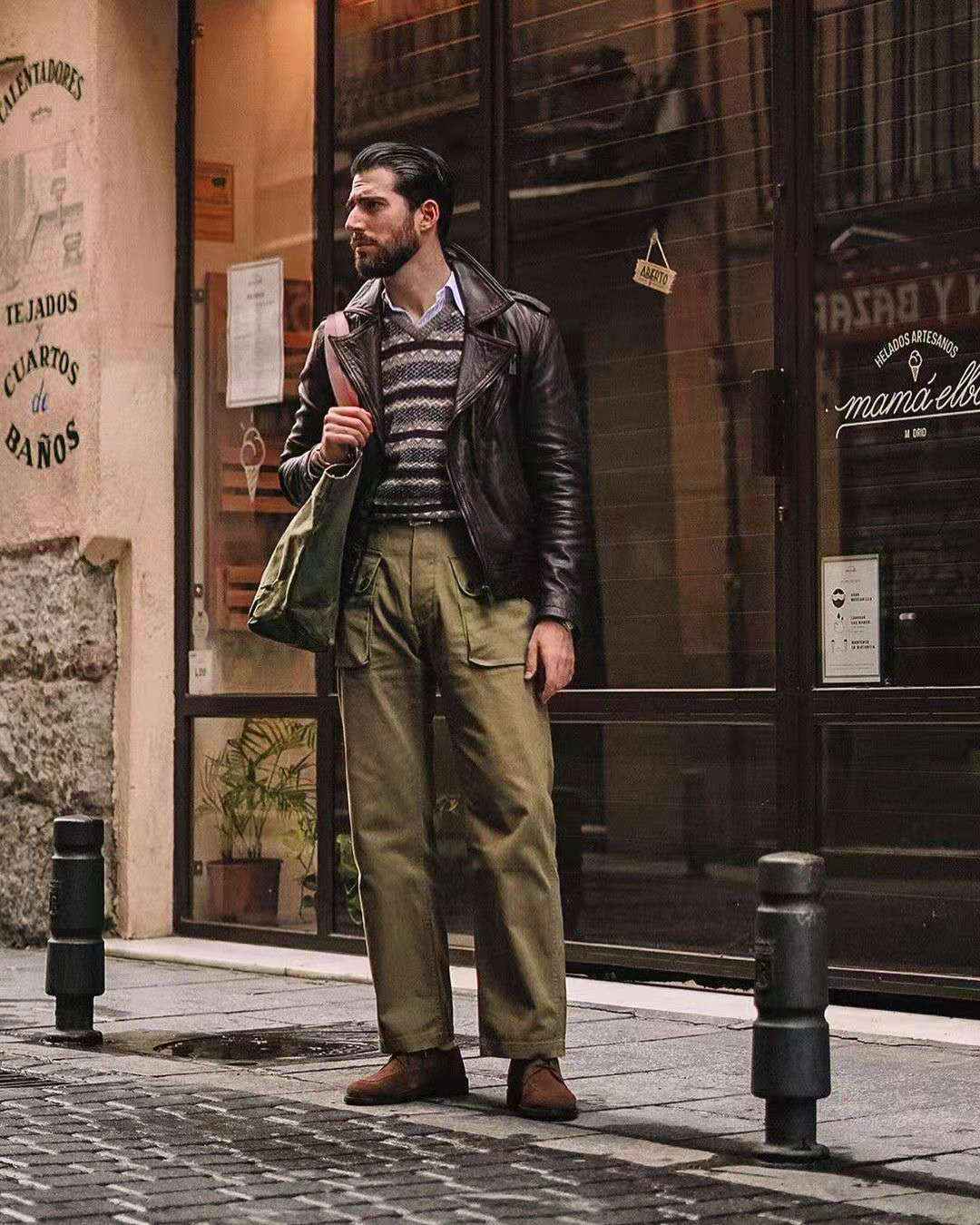 潮酷休闲风:皮衣展现男性阳刚洒脱,内搭条纹毛衣和衬衫,配经典卡其裤,成熟文雅。