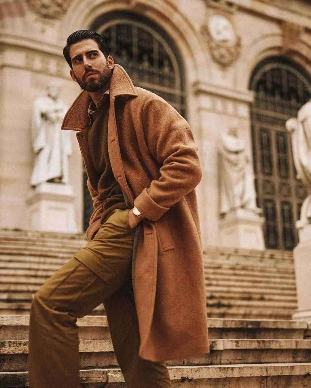 驼色大衣:经典驼色大衣,男女必备。男版更注重硬挺质感。